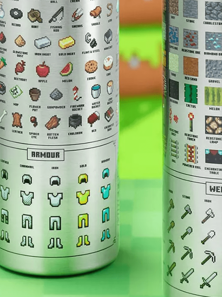 Minecraft-themed water bottle: this 16.9 fl oz double-walled stainless steel water bottle features iconic Minecraft designs including weapons, armor, blocks and more.