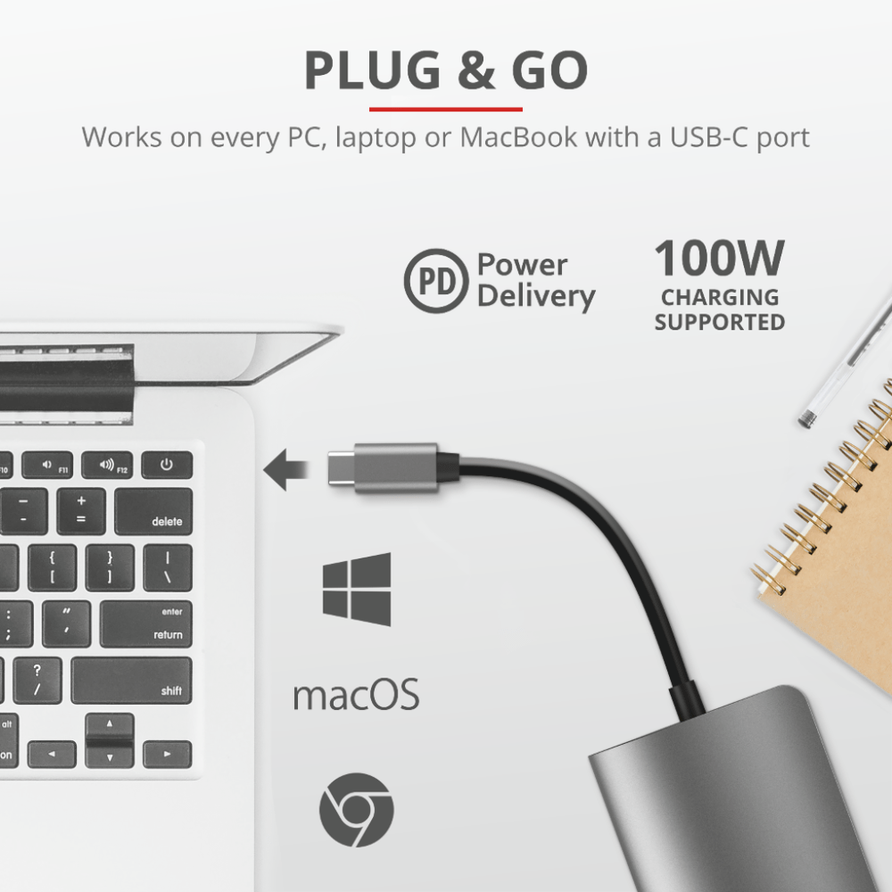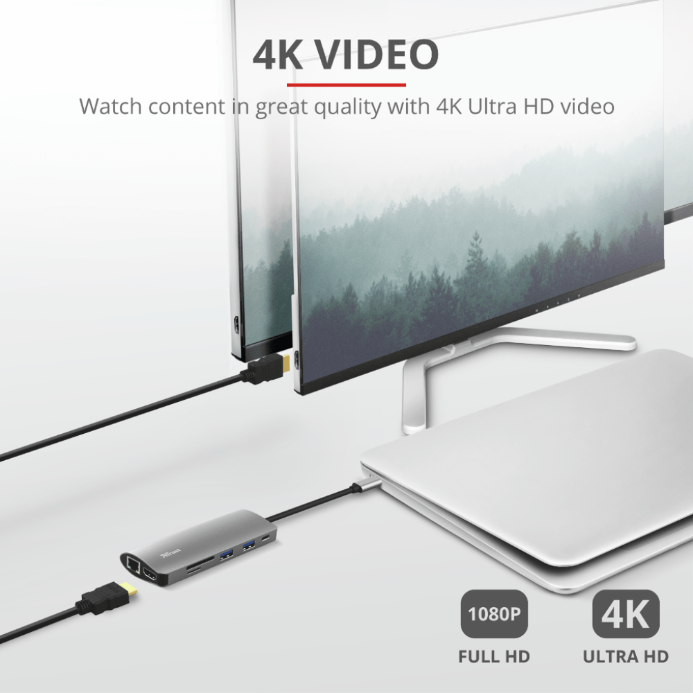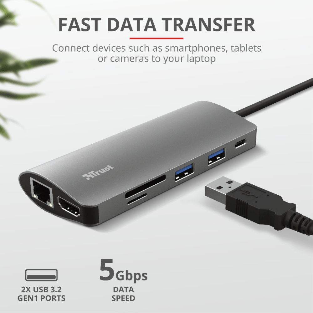 Connectivity Equals Productivity! Thin laptops are great, but their lack of connection ports can be a problem. Well, no more. With the Trust Dalyx 7-in-1 Adapter your productivity will increase seven-fold thanks to the included HDMI, Ethernet, memory card, USB and USB-C connections.