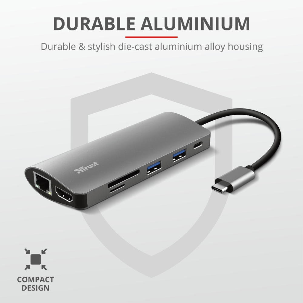 Thin laptops are great, but their lack of connection ports can be a problem. Well, no more. With the Trust Dalyx 7-in-1 Adapter your productivity will increase seven-fold thanks to the included HDMI, Ethernet, memory card, USB and USB-C connections.