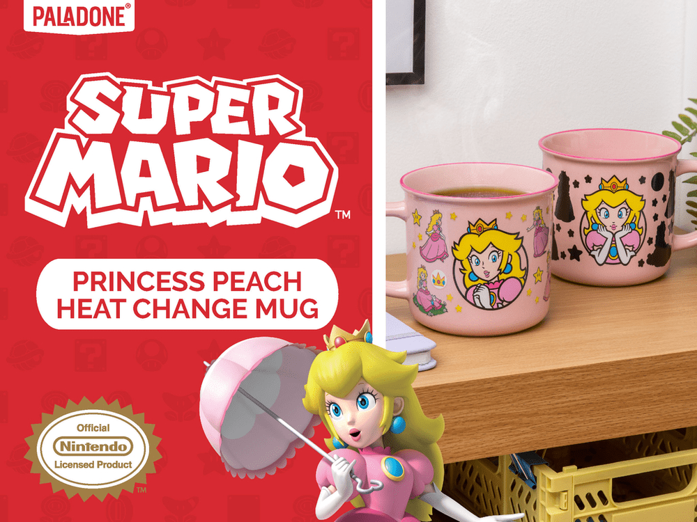 Enjoy your morning drink in style with this Super Mario™ Princess Peach Heat Change Mug.The 350ml (11 fl oz) pink heat-changing ceramic mug is perfect for coffee, tea or hot chocolate. Add your hot drink of choice and watch as the blacked-out silhouettes reveal vibrant images of Princess Peach.