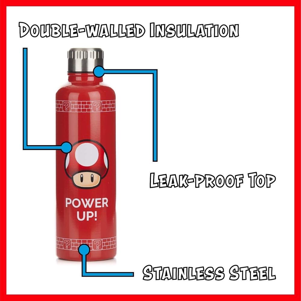 Bring a bit of Super Mario’s wild world into your everyday life with this stylish metal Big Up water bottle. Crafted from brushed stainless steel and detailed with the Power Up sponge from the wildly popular Super Mario Bros, this 500ml bottle is sure to make a statement wherever you take it. Perfect for use at home or on the go – easily slip it into your bag, backpack or car cup holder – and enjoy your favorite drink.