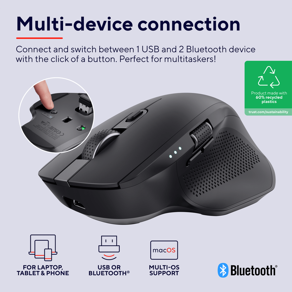 Need to quickly switch between working on multiple devices? The Ozaa+ has been designed for just that. Withmulticonnect capability, wirelessly connect up to three devices at once via a single USB 2.4GHz receiver or 2x Bluetooth.